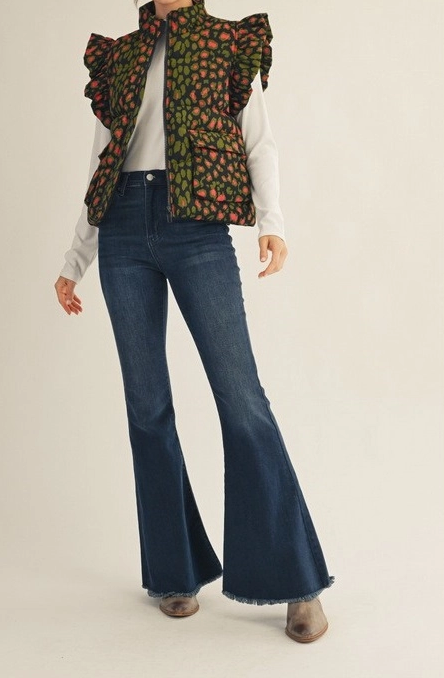 Unleash your wild side with the Ellen Leopard Vest! This multi-color vest features a leopard print and playful ruffle sleeves. Perfect for adding a touch of fun to any outfit.
