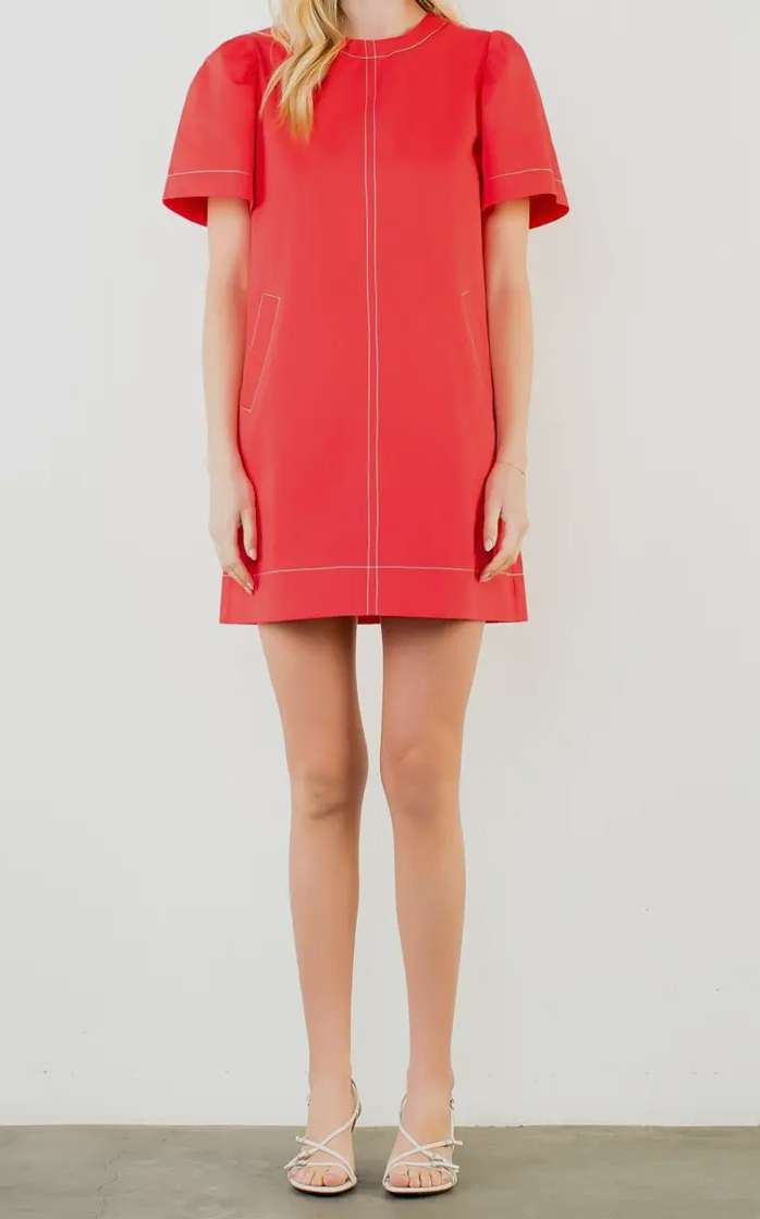 The Lane Dress is a stylish red short sleeve dress featuring a unique contrast stitch. Its vibrant color and comfortable fit make it perfect for any occasion. Dress it up or down for versatile looks that suit your lifestyle.
