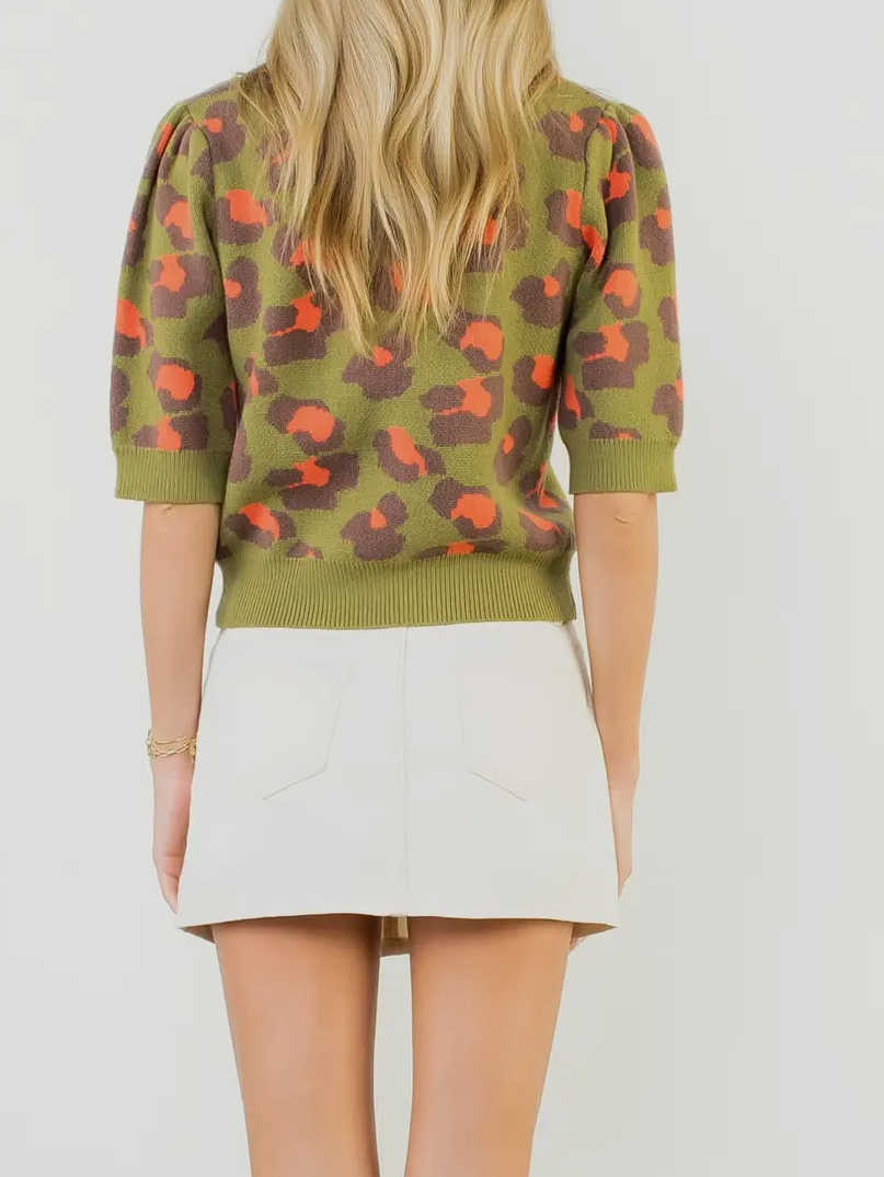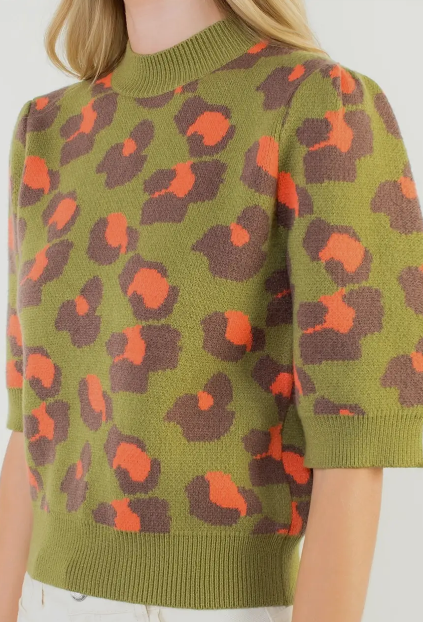 This short sleeve knit top features a bold olive, orange and brown leopard print, perfect for adding a touch of style to any outfit.