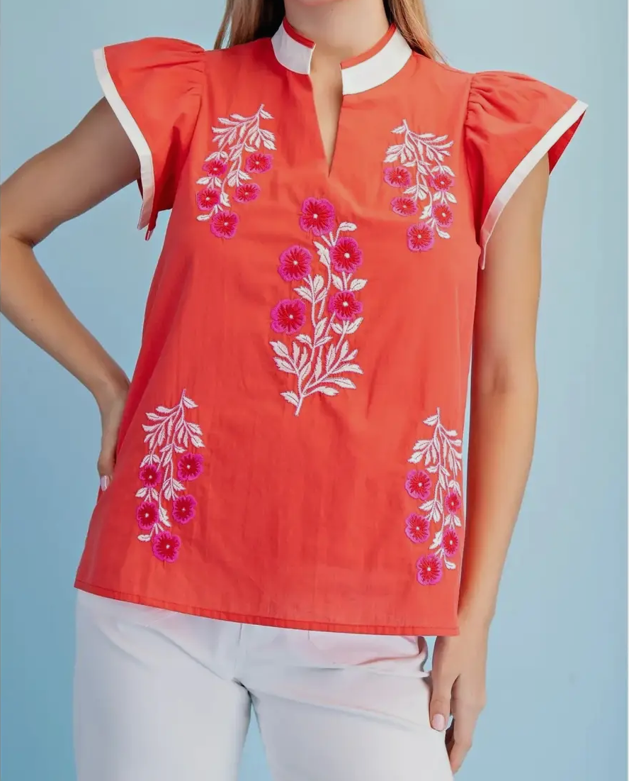 Brighten your wardrobe with the Shelby Top, featuring a stunning tomato red shade adorned with beautiful floral embroidery. This top is perfect for adding a splash of color to your outfits while ensuring you feel comfortable and stylish.