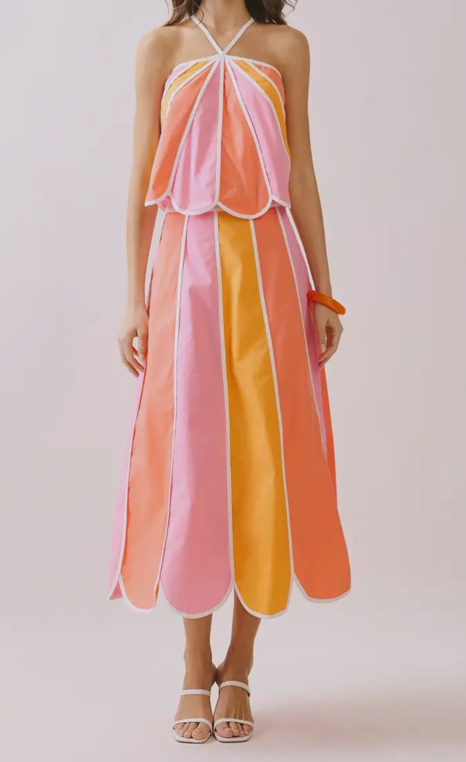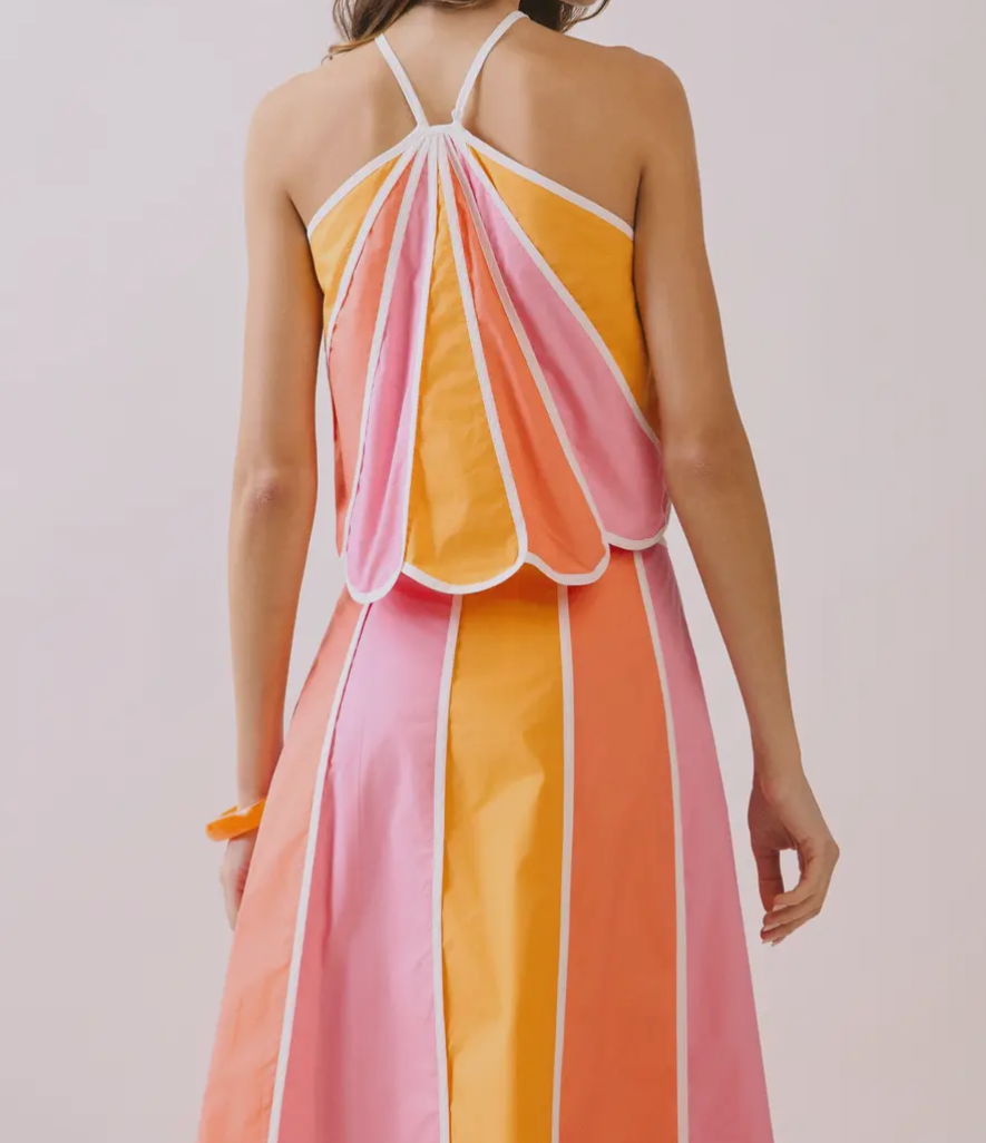 The Tori Set features a charming peach and pink color block design with a scalloped edge halter top and a flattering A-line midi skirt. This stylish combination brings a fresh, playful vibe to your wardrobe, perfect for any occasion.