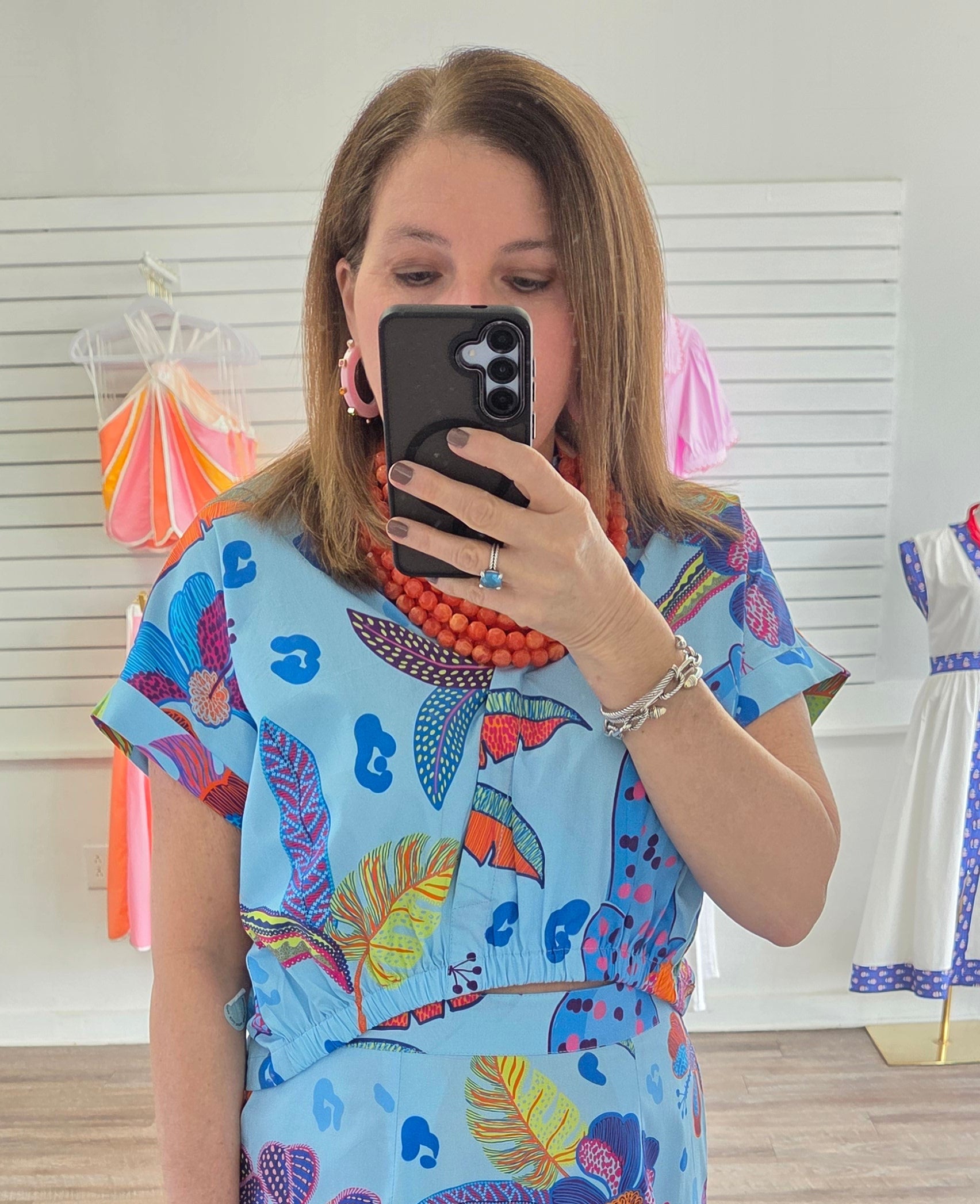 Meet the Zia Top, a stylish blue safari cropped top perfect for warm days. Its short sleeves keep you cool while adding a playful touch to your outfit. You'll love how comfortable and versatile this top is!